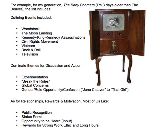 The “Great Melting Pot,” as the United States was called at the dawn of the 20th century, consisted, primarily, of Western Europeans, however, today’s melting pot is truly international. Asia, Latin America, Eastern Europe, and India are the jumping off points for millions of today’s immigrants. In addition to diverse cultures, the workplace often houses up to four different generations of workers; kind of a Pearl Harbor to Pearl Jam mixture of memories, attitudes, and expectations.