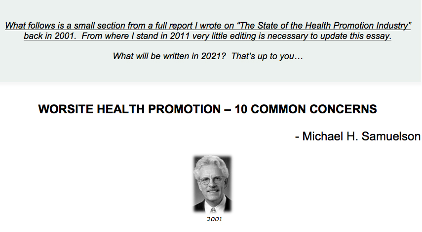 Need is only a part of the decision process. Interest, access, learning style, and belief in success are critical factors to consider when beginning a change program. Hypertension, diabetes, and high blood pressure may signal weight loss for someone who is morbidly obese. However, if distress is blocking visions of success, maybe a good stress reduction/management program is the way to go, first. On the other hand, maybe someone has recently loss a close friend or relative to lung cancer and their teachable moment has arrived. If finances are in runaway mode, maybe financial responsibility is the first step (yes, this is part of comprehensive DM/HP — check your VISA charges if you doubt this…). There are a number of factors that influence the whens, whats, hows, and whys of DM/HP. The more barriers you can remove and the more control you give to your employee the more likely the individual is to begin a program, stay with it, and springboard their success into other areas of change.