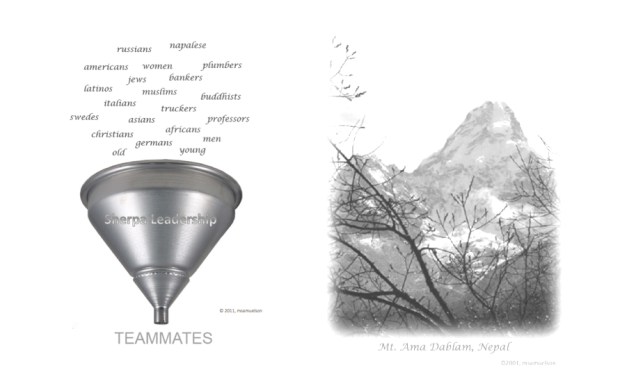 The sherpa does care about the mission, your commitment, training, endurance, flexibility, whole-person health, integrity, humanity, humility, team spirit, heart, guts and soul. He is a blind integrator of cultural backgrounds and beliefs and the ultimate discriminator of ability, drive and determination.