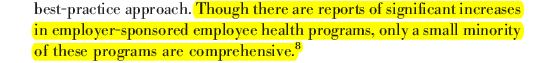 Researchers like Ron Goetzel, Jim Prochaska, and Dee Edington are doing a good job with data and, yes, employers like Volvo, MD Anderson, Healthwise and dozens more (notice I didn’t say hundreds more) are doing a good job of creating pockets of meaningful and replicable outcomes. That said, the wide brush paints a nation whose overall health continues to slip and slide in converse proportion to the dollars we spend.