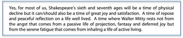 “…The sixth age shifts into the lean and slipper’d pantaloon, with spectacles on nose and pouch on side; his youthful hose, well sav’d, a world too wide for his shrunk shank; and his big manly voice, turning again toward childish treble, pipes and whistles in his sound. Last scene of all, that ends this strange eventful history, is second childishness and mere oblivion; sans teeth, sans eyes, sans taste, sans everything.”