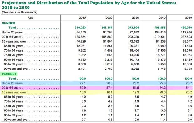 As I begin writing this section, the US population is 312,805,052. Of these residents, 13% are 65 or older. By 2020, that percentage will jump to 16.1%, a gain of 1.2%, while those under 20 will drop by .05% and those in the 20 – 64 cohort will drop by 1.2%. And, according to the US Census Bureau, by the year 2030 (closer than you think), seniors will comprise close to 20% of the total US population.