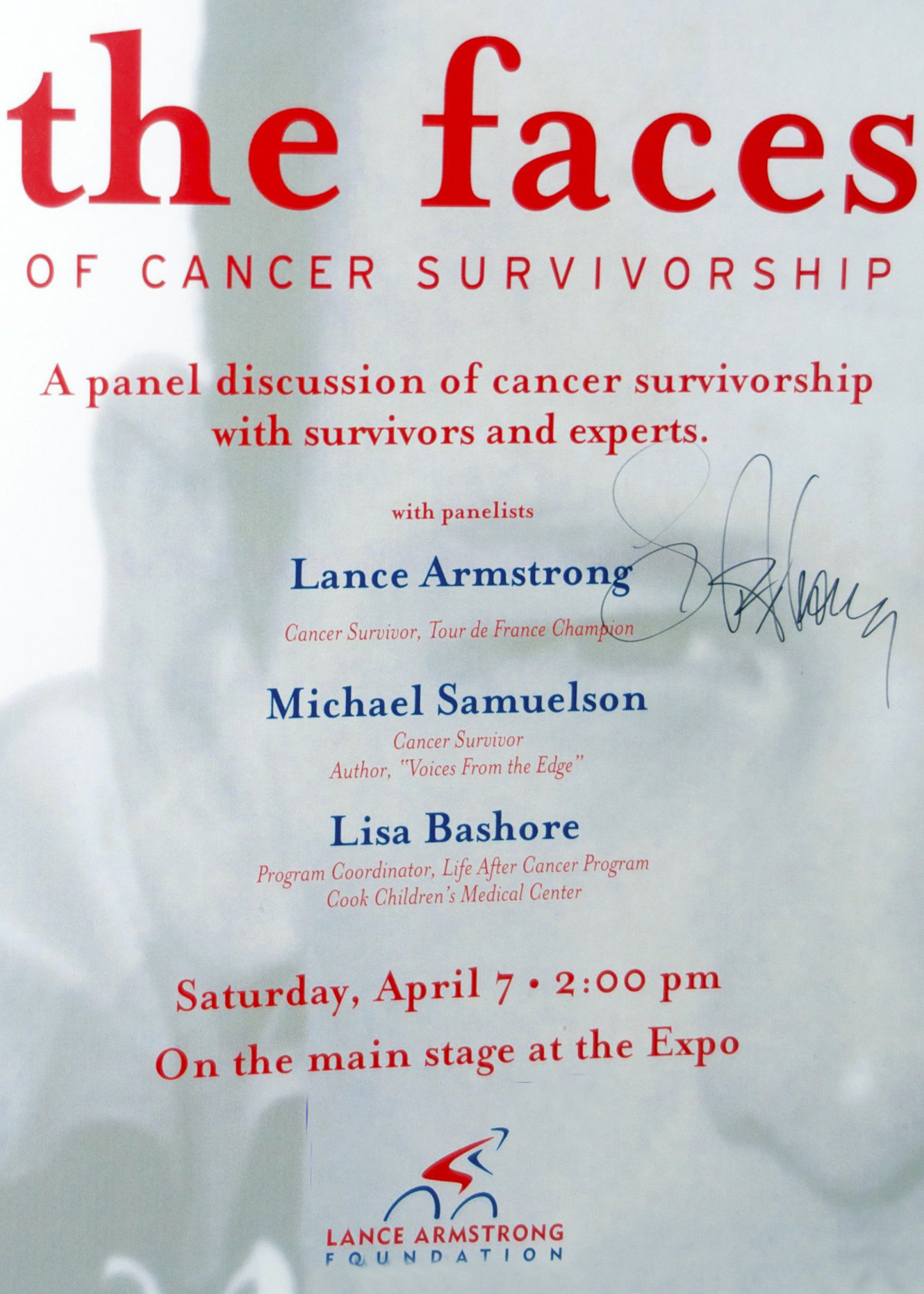 The accompanying photo is of a poster presented to me by The Lance Armstrong Foundation (now known as The LIVESTRONG Foundation), in 2001. Two years earlier, following a diagnosis of invasive ductal carcinoma, I had a modified radical mastectomy and my perspective on many things, all things, was forever changed. Since sharing the dais that afternoon in Austin with Lance and Lisa Bashore, I’ve delivered dozens of cancer survivorship talks throughout the nation including additional presentations at the request of LAF. I also participated in a Tour of Hope cycling event, a 50-mile ride into Washington, DC — led by Armstrong — to raise cancer awareness and funds for survivor support.  It was always my honor to contribute to this cause anytime, anywhere, anyway I could. Whenever LAF asked, whenever any cancer organization asked, the answer was/is always, without hesitation, yes.