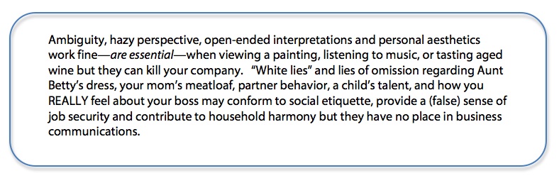 True story—with a little paraphrasing—but close enough to the real thing. The result of this inhibited culture of oblique-speak? The launch date was met but the initiative was was flawed at best with technical glitches , cumbersome administration, and considerable confusion. On top of that, it pulled key people off of mission-critical jobs, proved to be way more expense to launch and administer than originally planned, and it never recovered. It didn’t work.